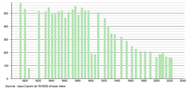 L'évolution du nombre d'habitants est connue à travers les recensements de la population effectués dans la commune depuis 1793. Pour les communes de moins de 10 000 habitants, une enquête de recensement portant sur toute la population est réalisée tous les cinq ans, les populations de référence des années intermédiaires étant quant à elles estimées par interpolation ou extrapolation[17]. Pour la commune, le premier recensement exhaustif entrant dans le cadre du nouveau dispositif a été réalisé en 2004[18].