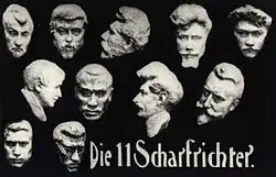 - (de) Cet article est partiellement ou en totalité issu de l’article de Wikipédia en allemand intitulé « Die Elf Scharfrichter » (voir la liste des auteurs).