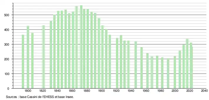 L'évolution du nombre d'habitants est connue à travers les recensements de la population effectués dans la commune depuis 1793. Pour les communes de moins de 10 000 habitants, une enquête de recensement portant sur toute la population est réalisée tous les cinq ans, les populations de référence des années intermédiaires étant quant à elles estimées par interpolation ou extrapolation[16]. Pour la commune, le premier recensement exhaustif entrant dans le cadre du nouveau dispositif a été réalisé en 2006[17].