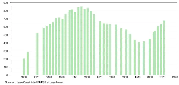 L'évolution du nombre d'habitants est connue à travers les recensements de la population effectués dans la commune depuis 1800. Pour les communes de moins de 10 000 habitants, une enquête de recensement portant sur toute la population est réalisée tous les cinq ans, les populations de référence des années intermédiaires étant quant à elles estimées par interpolation ou extrapolation[24]. Pour la commune, le premier recensement exhaustif entrant dans le cadre du nouveau dispositif a été réalisé en 2007[25].
