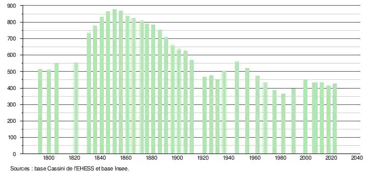 L'évolution du nombre d'habitants est connue à travers les recensements de la population effectués dans la commune depuis 1793. Pour les communes de moins de 10 000 habitants, une enquête de recensement portant sur toute la population est réalisée tous les cinq ans, les populations de référence des années intermédiaires étant quant à elles estimées par interpolation ou extrapolation[21]. Pour la commune, le premier recensement exhaustif entrant dans le cadre du nouveau dispositif a été réalisé en 2007[22].