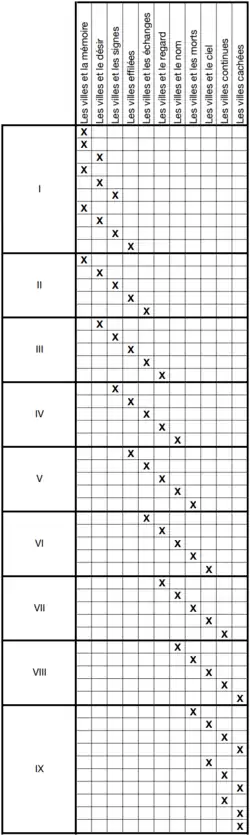 - Aurore Frasson-Marin, Italo Calvino et l'imaginaire, Slatkine, coll. « Textes et études. Domaine italien », (ISBN 2-05-100723-3), partie III, « La littérature du labyrinthe. B. Topologie et signes dans Les Villes invisibles », p. 251-282 — précédemment publié sous le titre « Structures, signes et images dans Les Villes invisibles d’Italo Calvino », Revue des études Italiennes, .