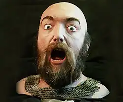 L'acteur Dominique Hulin en référence et le moulage de sa tête conçu par Jacques Gastineau pour les effets spéciaux de la scène où Godefroy décapite un soldat ennemi. | ||
