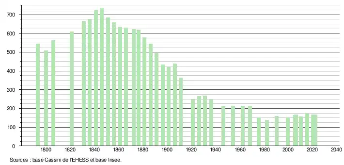L'évolution du nombre d'habitants est connue à travers les recensements de la population effectués dans la commune depuis 1793. Pour les communes de moins de 10 000 habitants, une enquête de recensement portant sur toute la population est réalisée tous les cinq ans, les populations de référence des années intermédiaires étant quant à elles estimées par interpolation ou extrapolation[21]. Pour la commune, le premier recensement exhaustif entrant dans le cadre du nouveau dispositif a été réalisé en 2005[22].