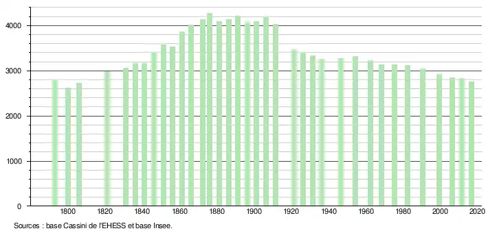 L'évolution du nombre d'habitants est connue à travers les recensements de la population effectués dans la commune depuis 1793. Pour les communes de moins de 10 000 habitants, une enquête de recensement portant sur toute la population est réalisée tous les cinq ans, les populations de référence des années intermédiaires étant quant à elles estimées par interpolation ou extrapolation[32]. Pour la commune, le premier recensement exhaustif entrant dans le cadre du nouveau dispositif a été réalisé en 2006[33].