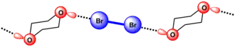 La première preuve cristallographique de la formation de la liaison halogène a été apporté par Hassel en 1954. Il a pu élucider la structure de la dibromo-1,4-dioxanate par diffraction des rayons X[9]. Il a ainsi montré que la cohésion de la structure du cristal est assurée par des liaisons halogènes entre le brome et l'oxygène. La présence d'une interaction entre le brome et l'oxygène induit une diminution de la distance O-Br dans le cristal (2,71 Å) qui est de ~ 20 % inférieure à la somme des rayons de van der Waals de l'oxygène et du brome(3.35 Å). Un alignement des atomes participant à la liaison halogène est aussi constaté, en effet l'angle entre les liaisons O-Br et Br-Br est proche de 180°. Ceci a permis à Hassel de conclure que les atomes d'halogènes sont directement liés aux paires d'électrons n du donneur et que la direction de la liaison coïncide avec les axes des orbitales des doublets libres dans les composés donneurs[10].