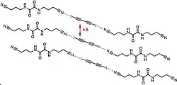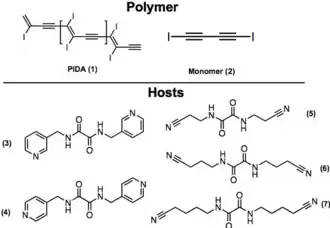 Goroff et al. ont préparé des poly(diiododiacétylène) ordonnés (PIDA) via le réarrangement du monomère (2) modulé par les liaisons halogènes. PIDA est excellent précurseur pour d'autres polymères conjugués, vue que l'iode peut être facilement échangé. Actuellement, la coupure de la liaison covalente C-I est possible par réduction électrochimique.