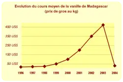 Le marché relativement restreint de la vanille, qui vise à satisfaire une demande attachée à l'authenticité naturelle, est soumis aux aléas climatiques et à la spéculation financière. Les cyclones tropicaux qui touchent fréquemment la côte orientale de Madagascar peuvent en effet détruire une part importante des vanilleraies ou de la récolte annuelle. Mais la vanille transformée pouvant être conservée plusieurs années, les groupements d'agriculteurs producteurs ou les négociants, s'ils en ont les moyens, peuvent aussi constituer des stocks d'attente, pour amortir les variations de prix ou au contraire profiter de ces variations.