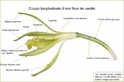 La fécondation naturelle nécessite l'intervention d'insectes spécifiques, présents uniquement dans les forêts denses dont la vanille est originaire en Amérique centrale[20]. Les responsables seraient des abeilles spécialisées dans le butinage des orchidées, les Euglossines, principalement l'espèce Euglossa viridissima et peut-être aussi Eulaema cingulata. Les Mélipones, notamment Melipona beecheii, considérées à une époque comme les fécondatrices de la vanille, semblent en revanche aujourd'hui écartées par les entomologistes[21]. Après la fécondation, l'ovaire qui faisait office de pédoncule à la base de la fleur se transforme en une gousse pendante longue de 12 à 25 centimètres. Les gousses fraîches et encore inodores ont un diamètre de 7 à 10 millimètres. Elles contiennent des milliers de graines minuscules qui seraient libérées par éclatement des fruits à maturité si les paysans ne veillaient à récolter ceux-ci encore verts.