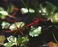 • Les mâles ont le corps entièrement rouge ou orange foncé, y compris les yeux, les pattes et les nervures des ailes. Les femelles sont généralement d'un brun moyen ou foncé avec de fines rayures jaunes et les pattes sont rougeâtres.
