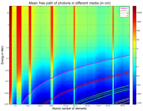 Libre parcours moyen pour des photons de 1 keV à 20 MeV et des éléments de numéro atomique Z = 1 à 100. Basé sur des données tirées de NIST[4]. Les discontinuités sont dues à la faible densité des éléments gazeux. Six bandes correspondent aux voisinages de 6 gaz nobles.
