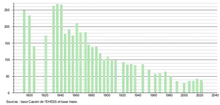 L'évolution du nombre d'habitants est connue à travers les recensements de la population effectués dans la commune depuis 1793. Pour les communes de moins de 10 000 habitants, une enquête de recensement portant sur toute la population est réalisée tous les cinq ans, les populations de référence des années intermédiaires étant quant à elles estimées par interpolation ou extrapolation[22]. Pour la commune, le premier recensement exhaustif entrant dans le cadre du nouveau dispositif a été réalisé en 2006[23].