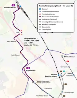 La ligne 3 du tramway a été prolongée en de Burgfelderhof jusqu'à la gare de Saint-Louis en France, où est implanté un parking relais. L’enquête publique relative à cette extension côté français s’est déroulée de mi-octobre à mi-, suivie par la « Planauflage » côté suisse, de novembre à . Les deux enquêtes ont reçu un avis favorable. Le démarrage des travaux de déviation des réseaux a eu lieu en côté français. Le terminus actuel a été supprimé et remplacé par une nouvelle station Burgfelderhof située 500 mètres plus au nord au niveau de la frontière franco-suisse. La section française compte quatre nouvelles stations.