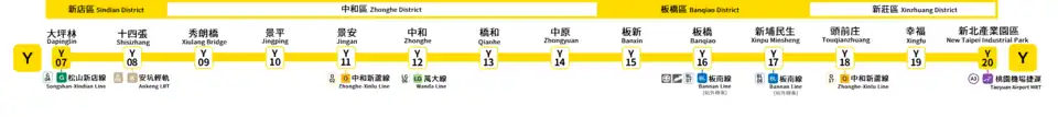 | Y20 | New Taipei Industrial Park | 新北產業園區 | Correspondance avec le ligne d'aéroport de Taoyuan | ||||