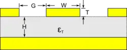 Une ligne coplanaire est une ligne de transmission formé par une piste bordée de chaque côté par une ligne retour. Cette géométrie est utilisée en microélectronique comme sur les circuits imprimés. Un plan de masse peut s'y ajouter[2].