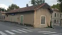 Maussane-les-Alpilles : le bâtiment voyageur abrite aujourd'hui la salle Jean Favier, construite en extension. D'ouest en est, la voie ferrée a été effacée au profit du chemin des Batignolles, de l'avenue des Alpilles et de la D17.