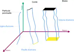 Une ligne d'univers trace la trajectoire d'un seul point dans l'espace-temps. Une feuille d'univers est la surface bidimensionnelle analogue, tracée par une ligne (comme une corde) voyageant à travers l'espace-temps. La feuille d'univers d'une corde ouverte est un ruban, et celle d'une corde fermée, un cylindre.