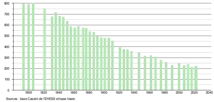 L'évolution du nombre d'habitants est connue à travers les recensements de la population effectués dans la commune depuis 1793. Pour les communes de moins de 10 000 habitants, une enquête de recensement portant sur toute la population est réalisée tous les cinq ans, les populations de référence des années intermédiaires étant quant à elles estimées par interpolation ou extrapolation[31]. Pour la commune, le premier recensement exhaustif entrant dans le cadre du nouveau dispositif a été réalisé en 2006[32].
