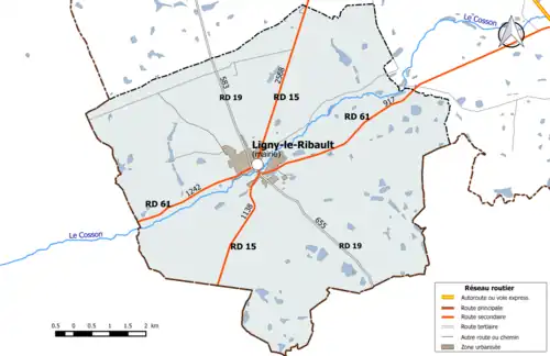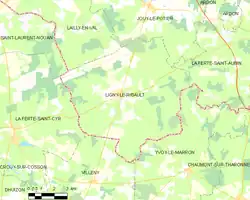 Carte de la commune de Ligny-le-Ribault et des communes limitrophes.