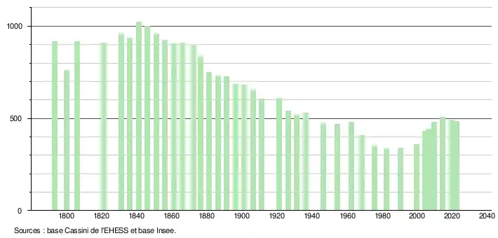 L'évolution du nombre d'habitants est connue à travers les recensements de la population effectués dans la commune depuis 1793. Pour les communes de moins de 10 000 habitants, une enquête de recensement portant sur toute la population est réalisée tous les cinq ans, les populations de référence des années intermédiaires étant quant à elles estimées par interpolation ou extrapolation[15]. Pour la commune, le premier recensement exhaustif entrant dans le cadre du nouveau dispositif a été réalisé en 2004[16].