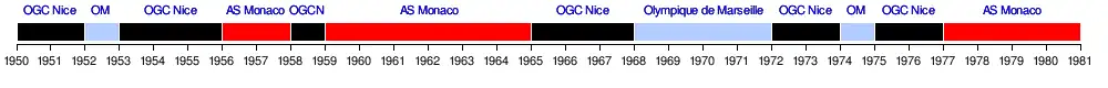Seulement trois d'entre eux ont cependant réussi à décrocher des titres nationaux, l'Olympique de Marseille qui remporte pas moins de neuf titres de champion de France, dix coupes de France, trois coupes de la Ligue, trois trophées des champions,une Ligue des champions et une coupe Charles Drago, l'AS Monaco qui remporte huit titres de champion de France, cinq coupes de France, une coupe de la Ligue, deux trophées des champions et une coupe Charles Drago, et l'OGC Nice qui remporte quatre titres de champion de France, trois coupes de France et une coupe Charles Drago.