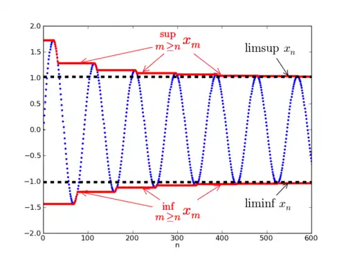 (La finitude de lim sup — ou de lim inf — pour une suite bornée fournit donc une preuve sophistiquée d'un cas particulier — par ailleurs élémentaire — du théorème de Bolzano-Weierstrass.)