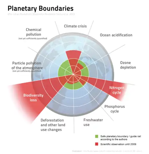 En 2009, une équipe internationale de vingt-six chercheurs, menés par Johan Rockström du Stockholm Resilience Centre (en) et Will Steffen de l'université nationale australienne, publie un article dans les revues Nature[3] et Ecology and Society (en)[4], dans lequel elle identifie neuf planetary boundaries (« limites planétaires ») à ne pas dépasser si l’humanité veut pouvoir se développer dans un écosystème sûr, c’est-à-dire évitant les modifications brutales, non-linéaires, potentiellement catastrophiques et difficilement prévisibles de l’environnement. Parmi ces chercheurs figurent notamment le climatologue James E. Hansen (directeur du Goddard Institute for Space Studies de la NASA, pionnier des recherches sur le changement climatique), Paul Josef Crutzen (prix Nobel de chimie 1995), le climatologue allemand Hans Joachim Schellnhuber (fondateur du Potsdam-Institut für Klimafolgenforschung et conseiller du gouvernement allemand et de la Commission européenne sur le réchauffement climatique) et le géographe belge Éric Lambin.