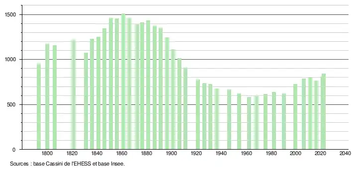 L'évolution du nombre d'habitants est connue à travers les recensements de la population effectués dans la commune depuis 1793. Pour les communes de moins de 10 000 habitants, une enquête de recensement portant sur toute la population est réalisée tous les cinq ans, les populations de référence des années intermédiaires étant quant à elles estimées par interpolation ou extrapolation[36]. Pour la commune, le premier recensement exhaustif entrant dans le cadre du nouveau dispositif a été réalisé en 2006[37].
