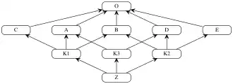 Dans cette section, nous allons considérer le graphe de dépendance dans la figure de droite. Les sommets Z, K1, K2, K3, A, B, C, D, E, O sont des classes. Dans la figure, il y a une flèche, lorsqu'une classe hérite d'une autre. Par exemple, la flèche Z → K1 indique que la classe Z hérite de K1. Il y a de l'héritage multiple : par exemple Z hérite de K1, K2 et K3.