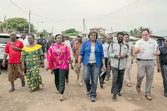 Linda Thomas-Greenfield (au centre) au Ghana, lors d'une visite d'inspection et de soutien à un projet soutenu par l'USAID visant à améliorer l'accès à l'eau potable, l'assainissement et l'hygiène pour stopper la septième pandémie de choléra au Ghana ().