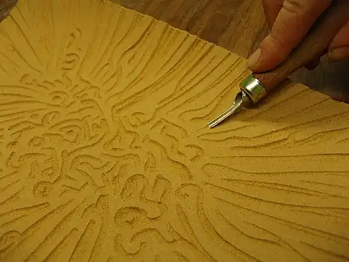 Elle est dérivée de la xylographie ; on y retrouve donc les mêmes principes techniques[3] : taille en épargne des blancs, estampe obtenue par pression et transfert de l'encre disposée sur les zones non creusées sur le support.