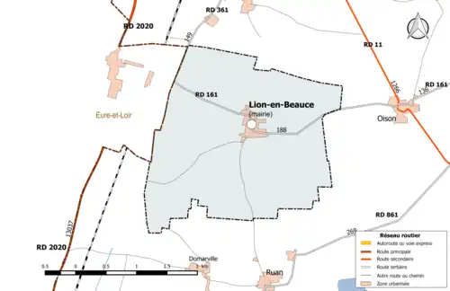 La route départementale 161 traverse le territoire de la commune. Lion-en-Beauce est desservie par les sorties 13 de l'autoroute A10 et 7 de l'A19.
