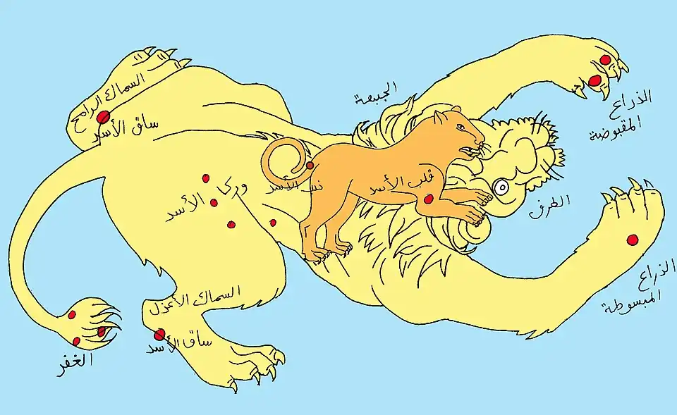 Avant de reprendre des Grecs la figure de Λέων parmi leurs constellations, les Arabes avaient déjà, dans le ciel traditionnel, al-Asad, « le Lion », comme signe zodiacal, attesté dans l’horoscope de fondation de la ville de Baghdad en 762, ainsi que nous rapporte l’érudit persan al-Bīrūnī[5]. Ils voyaient, organisé à partir des stations lunaires (manāzil al-qamar), un « Superlion » couvrant sur l’écliptique l’espace allant d’un côté de la partie supérieure des Gémeaux et de l’autre du Petit Chien, aux dernières étoiles de la Vierge[6].
