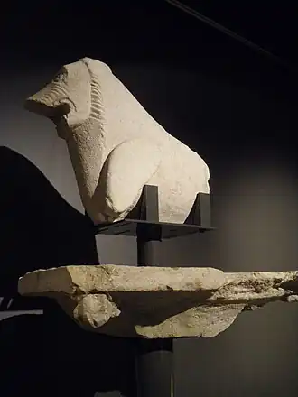 La pièce du IVe siècle av. J.-C. trouvée dans la nécropole ibérique de La Fuentecica del Tío Carrulo par Santos Sánchez Valera. C. trouvée dans la nécropole ibérique de La Fuentecica del Tío Carrulo par Santos Sánchez Valera (Coy, Lorca) ; elle devait faire partie d'un monument ibérique du type connu sous le nom de "Pilar Estela", composé d'un podium à deux ou trois marches et d'un pilier central supportant un chapiteau et, sur celui-ci, la figure d'un animal de la mythologie ibérique de l'époque. Le lion est représenté assis, la tête en avant et les pattes avant tendues vers l'avant. Le corps volumineux est animé par de grandes incisions qui marquent les côtes et la cage thoracique.