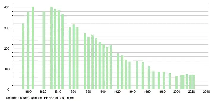 L'évolution du nombre d'habitants est connue à travers les recensements de la population effectués dans la commune depuis 1793. Pour les communes de moins de 10 000 habitants, une enquête de recensement portant sur toute la population est réalisée tous les cinq ans, les populations de référence des années intermédiaires étant quant à elles estimées par interpolation ou extrapolation[22]. Pour la commune, le premier recensement exhaustif entrant dans le cadre du nouveau dispositif a été réalisé en 2008[23].