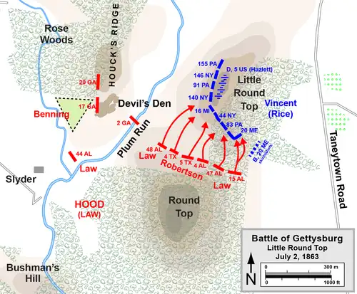 Le , aux alentours de 16 h, le général confédéré James Longstreet lance une attaque pour prendre l'armée de l'Union de flanc[2]. La division du général John Bell Hood doit prendre position à Devil's Den mais, pour diverses raisons (la présence de soldats unionistes sur cette position, le terrain qui a désorganisé les régiments confédérés...), elle se retrouve au nord-ouest de Round Top[3],[4].