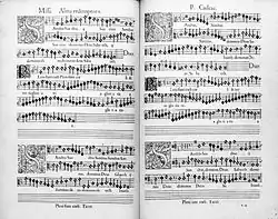 Lorsqu'il contient de la musique polyphonique, toutes les voix sont disposées côte à côte (superius et tenor à gauche, altus et bassus à droite, en général). Cette disposition génère une contrainte particulière quand une pièce est notée sur plusieurs pages : au moment de tourner la page, les voix doivent arriver en même temps en fin de page (ceci demande un soin particulier au copiste ou à l'imprimeur).