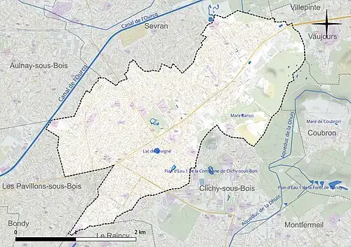 La ville est bordée à l’Ouest par le canal de l’Ourcq et à l’Est par les coteaux de l’Aulnoye et le plateau de Clichy-sous-Bois vers Montfermeil et est située sur l’ex-RN3 qui relie Paris par la porte de Pantin à Meaux, elle donc est la première commune en agglomération que l’on rencontre en venant de l’Est francilien[PLU 1].