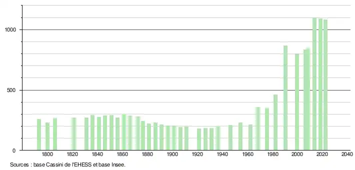 L'évolution du nombre d'habitants est connue à travers les recensements de la population effectués dans la commune depuis 1793. Pour les communes de moins de 10 000 habitants, une enquête de recensement portant sur toute la population est réalisée tous les cinq ans, les populations de référence des années intermédiaires étant quant à elles estimées par interpolation ou extrapolation[37]. Pour la commune, le premier recensement exhaustif entrant dans le cadre du nouveau dispositif a été réalisé en 2008[38].