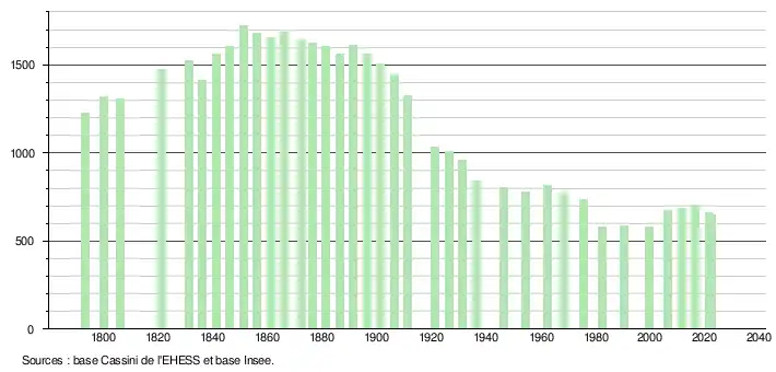 L'évolution du nombre d'habitants est connue à travers les recensements de la population effectués dans la commune depuis 1793. Pour les communes de moins de 10 000 habitants, une enquête de recensement portant sur toute la population est réalisée tous les cinq ans, les populations de référence des années intermédiaires étant quant à elles estimées par interpolation ou extrapolation[17]. Pour la commune, le premier recensement exhaustif entrant dans le cadre du nouveau dispositif a été réalisé en 2006[18].