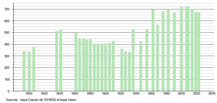 L'évolution du nombre d'habitants est connue à travers les recensements de la population effectués dans la commune depuis 1793. Pour les communes de moins de 10 000 habitants, une enquête de recensement portant sur toute la population est réalisée tous les cinq ans, les populations de référence des années intermédiaires étant quant à elles estimées par interpolation ou extrapolation[15]. Pour la commune, le premier recensement exhaustif entrant dans le cadre du nouveau dispositif a été réalisé en 2008[16].