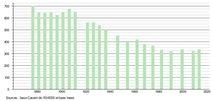 Commentaire : Depuis sa création en 1867, la population de la commune a décliné régulièrement pendant plus d'un siècle jusqu'en 1990, perdant 383 habitants entre 1876 et 1990 soit -54,6 % de sa population en 114 ans, atteignant donc en 1990 son minimum démographique. Ces vingt dernières années, la population s'est stabilisée, enregistrant même un léger regain démographique. La densité de population est de 40 habitants par km2.