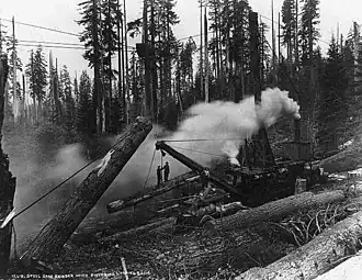 Débardage au câble avec une grue à vapeur, Chaîne des Cascades, États-Unis, 1918.