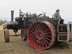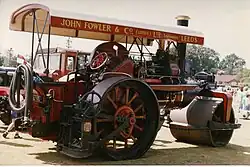 Locomobile automotrice à treuil John Fowler. La roue horizontale faisant office de treuil est visible sous le corps de la machine. Avec une charrue à bascule l'ensemble pouvait être qualifié de charrue à vapeur.