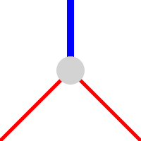 La figure ci-contre représente un sommet d'un graphe contraint. On suppose son flot entrant minimal est 2. Les deux arcs rouges pondérés par 1 représentent les deux entrées de la porte. L'un des arcs représente la valeur vraie s'il est dirigé vers le sommet, et faux sinon. L'arc bleu est pondéré par 2 et représente la sortie de la porte. Il est vrai s'il est sortant. La table suivante donne la table de vérité d'un ET et l'interprétation sur la porte ET dans un graphe contraint :