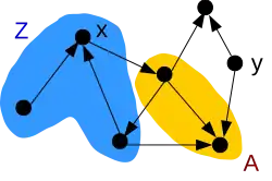 MSO a été défini sur des classes de graphes (par exemple, non orientés). Par exemple, on peut exprimer en MSO qu'un graphe n'est pas connexe[3] : qui se lit « il existe un ensemble de sommets Z tel qu'il existe un sommet x contenu dans Z et un sommet y en dehors de Z et tel que si deux sommets u et v sont reliés par une arête, alors u est dans Z si et seulement si v est dans Z » (voir figure à droite). La connexité n'est pas définissable en logique du premier ordre (c'est une conséquence du théorème de compacité de la logique du premier ordre[4]). Ainsi MSO est strictement plus expressive que la logique du premier ordre sur les graphes.