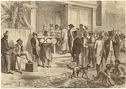 Le , le Treizième amendement de la Constitution des États-Unis est ratifié, abolissant l'esclavage dans l'ensemble du pays[7],[8], avec une réserve pénale : « Ni esclavage ni servitude involontaire, si ce n'est en punition d'un crime dont le coupable aura été dument condamné, n'existeront aux États-Unis ni dans aucun des lieux soumis à leur juridiction »[9]. Commence alors la période dite de la Reconstruction, qui dure de 1865 à 1877. Au cours de cette période, les lois fédérales protègent les Afro-Américains affranchis et les quelques Noirs déjà libres avant la guerre de Sécession comme le Quatorzième amendement de la Constitution des États-Unis de 1868, accordant la citoyenneté à toute personne née ou naturalisée aux États-Unis et interdisant toute restriction à ce droit, et le Quinzième amendement de la Constitution des États-Unis, de 1870, garantissant le droit de vote à tous les citoyens des États-Unis. Dans les années 1870, le parti démocrate regagne du pouvoir dans les États du Sud[10], utilisant des milices terroristes comme la White League ou le Ku Klux Klan pour empêcher l'organisation républicaine et empêcher les Noirs de voter[11].