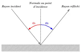 L'angle orienté θ2 pris entre la normale au point d'incidence et le rayon réfléchi est dit angle de réflexion.