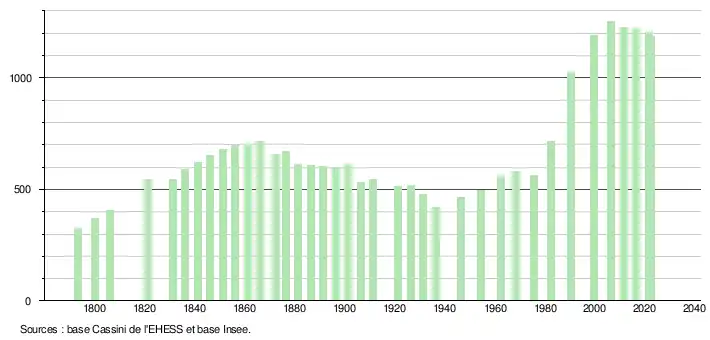 L'évolution du nombre d'habitants est connue à travers les recensements de la population effectués dans la commune depuis 1793. Pour les communes de moins de 10 000 habitants, une enquête de recensement portant sur toute la population est réalisée tous les cinq ans, les populations de référence des années intermédiaires étant quant à elles estimées par interpolation ou extrapolation[25]. Pour la commune, le premier recensement exhaustif entrant dans le cadre du nouveau dispositif a été réalisé en 2006[26].