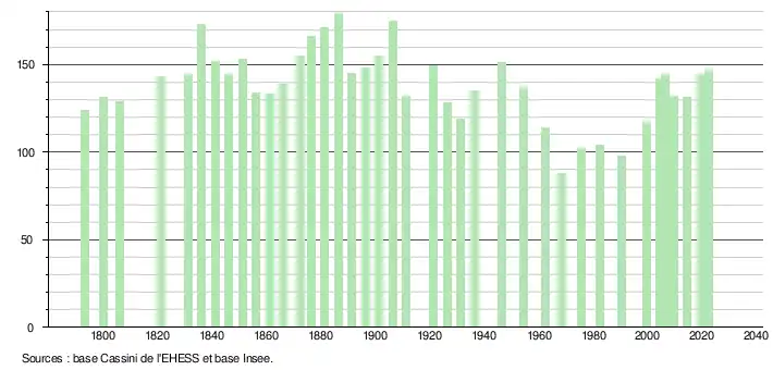 L'évolution du nombre d'habitants est connue à travers les recensements de la population effectués dans la commune depuis 1793. Pour les communes de moins de 10 000 habitants, une enquête de recensement portant sur toute la population est réalisée tous les cinq ans, les populations de référence des années intermédiaires étant quant à elles estimées par interpolation ou extrapolation[41]. Pour la commune, le premier recensement exhaustif entrant dans le cadre du nouveau dispositif a été réalisé en 2004[42].